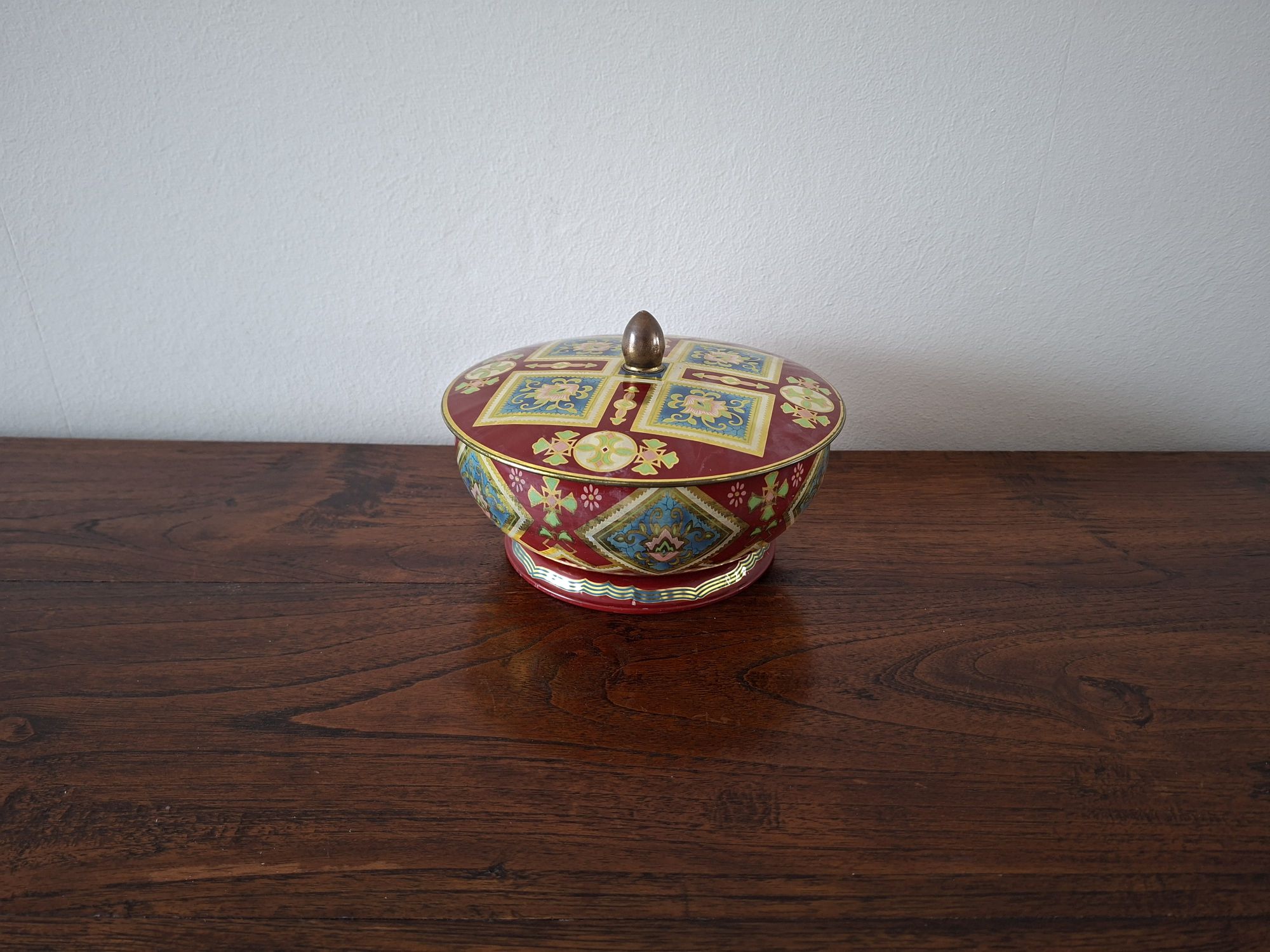 Leuk kleurrijk oud blikje met deksel.