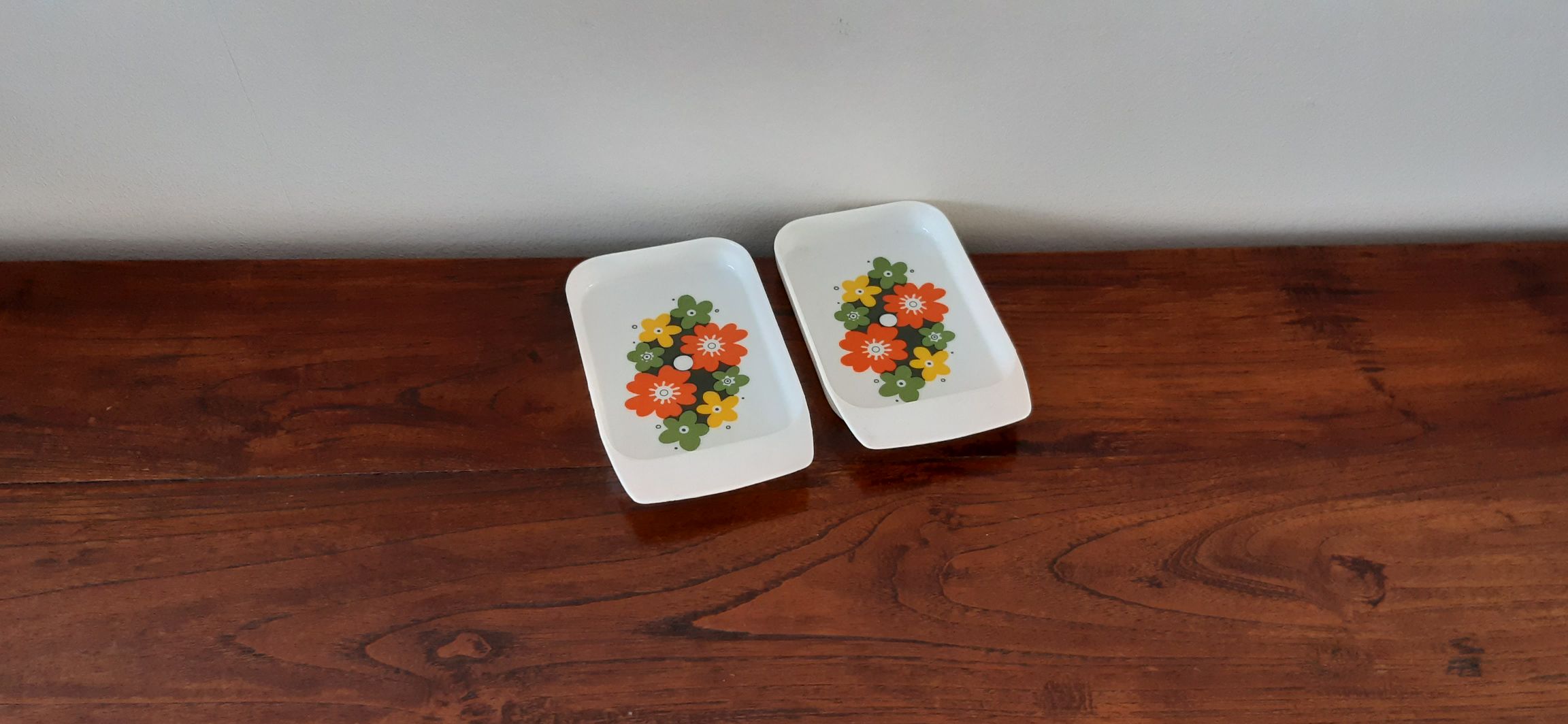 Kleine vintage kunststof schaaltjes met bloemmotief.
